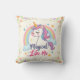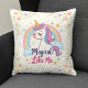 Um design de travesseiro decorativo branco mostrando um unicórnio pastel com um homem suave e fluente em tons de rosa suave, lavanda, verde-menta e azul-bebê com o texto "Magical Like Me" e um nome personalizado na parte de trás da camisa. A calma e sonhadora expressão do unicórnio irradia tranquilidade.