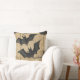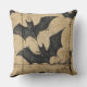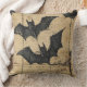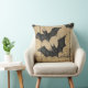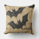 Travesseiro decorativo de retalhamento de Dia das Bruxas de Denim Esbranquiçado com morcegos em voo. Textura aflita, ao estilo do grunge, com pontos negros cria uma estética gótica rústica. Ideal para amantes de morcegos, décor gótico, ou presentes únicos de Halloween.