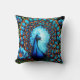 Um pavão vibrante mostra sua magnífica plumagem cercada por flores azuis brilhantes e padrões intrincados, criando um impressionante contraste visual.