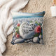 Uma pedra em forma de coração com o nome Barbara esculpida nela, cercada por delicadas rosas cor-de-rosa e seixos brancos lisos numa praia.