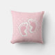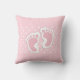 Travesseiro com uma imagem adorável de pegadas de menina rosa com um contorno branco pesado e bolinhas brancas sobre um fundo rosa atrás da ilustração.