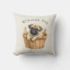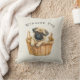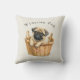 adicione o nome do seu pug a esta bela almofada com um pug castanho sentado em uma cesta de vime, tudo sobre um fundo creme. você pode mudar o acabamento do tecido para atender às suas necessidades.