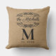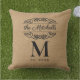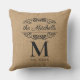Almofada de exterior divertida e fofa com estilo rústico de juta bege com um motivo de banner de filigrana floral antiga. Com espaço para personalizar ou customizar com o nome da família, monograma e data do ano de estabelecimento à sua escolha.