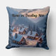 A cozy mountain village blanketed in snow, glowing windows, smoke rising from chimneys, and twinkling string lights along rooftops as the sun sets behind pine-covered hills.