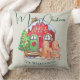 Este travesseiro decorativo de Natal personalizado apresenta uma ilustração do estilo aquoso das pessoas de pão de gengibre. Um homem e uma senhora de pão de gengibre estão em frente à sua colorida casa de pão de gengibre. Uma árvore decorada bonito está à esquerda. O fundo é um verde macio com texto marrom.