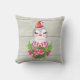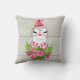 Um travesseiro com um design bonitinho e caprichoso com um adorável pinguim vestindo um chapéu de santa vermelho. Ficando atrás de um buquê de flores com canas doces listradas cor-de-rosa e branca. Fundo de madeira falsa.