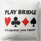 Mostre sua ponte tortuosa/senso de humor de ponte duplicado com este travesseiro decorativo com os quatro naipes de placa junto com o ditado "Jogue ponte é mais barato que terapia". Faça com que outros façam uma dupla jogada da próxima vez que você jogar bridge com esta ponte memorável dizendo travesseiro decorativo! Não precisa ser um ávido jogador de ponte para curtir!