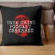 Um travesseiro decorativo para os verdadeiros amantes de podcasts criminais em todo o mundo, com uma impressão digital sangrenta, com o texto "True Crime Podcast Obcecado".