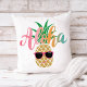 Travesseiro decorativo tropical, divertido, com um abacaxi sorridente, vestindo óculos de sol com uma saudação Aloha em cores de praia de verão (rosa, coral, laranja, azul-aqua). Trabalho de arte original do KL Stock.