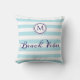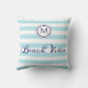 Melhore a sua decoração com o estilo litorâneo relaxado, com este travesseiro monograma listrado azul claro e branco. Um sotaque fresco e náutico para a sua casa, o design apresenta as palavras 'Beach Vibes' na tipografia da escrita marinho azul, e uma inicial personalizada dentro de círculos em estilo de vigia. Quer você esteja colocando sua casa, casa de praia ou barco, este travesseiro adiciona um toque de encanto à beira-mar a qualquer sala.