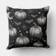 Um travesseiro decorativo de padrão de Halloween preto-e-branco, com abóboras intricadamente esboçadas, morcegos, teias de aranha detalhadas e sotaques celestes como estrelas e lua crescente. O trabalho feito à mão e os elementos noturnos assustadores criam um eterno, estética estranha perfeita para designs góticos e inspirados no outono.