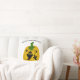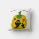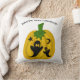 Este travesseiro decorativo apresenta abóboras laranja, fantasmas pretos, estrelas e luas com as palavras "Feliz Dia das Bruxas" acima do design.