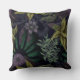 Um travesseiro decorativo floral contemporâneo em roxo escuro e verde sobre fundo preto com flores e folhas grandes, um travesseiro moderno e na moda para qualquer quarto.