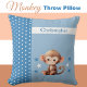 Travesseiro decorativo/almofada de lado duplo para o quarto/berçário/sala de reprodução de uma criança. Este travesseiro azul e branco tem bolinhas, estrelas e um macaco fofo, que você pode personalizar com um nome.