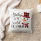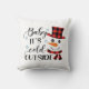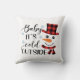 Este travesseiro apresenta o título da canção de Natal "Baby It's Cold Outside" em letra preta com script. Um boneco de neve sorridente dona um chapéu vermelho e preto de xadrez de búfalo e cachecol com sotaques azuis de floco de neve.