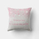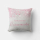 Um travesseiro para uma sala de Quinceañera, com 15 anos de idade. Um fundo metálico falso prateado com gotas de brilho falso rosa, manchas. O texto: Quinceañera é escrito a rosa com um grande estilo escrito à mão. Personalize e adicione um nome.