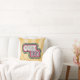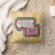 Travesseiro da festa da noite de perguntas. Com tipografia grande e ousada cercada por luzes de camarim. O fundo é um padrão amarelo de explosão solar.