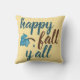 Travesseiro decorativo de queda, bonito e de moda! A tipografia moderna de escrita fala em francês e o marrom diz "feliz outono y'all" próximo a uma folha de queda azul. Fundo de ouro mudado. Excelente para este outono!