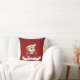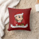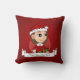 Travesseiro decorativo com uma ilustração de uma garota sorridente e fofinha de cabelo castanho, a menina está vestindo um traje de Santa Cláusula com chapéu vermelho e segurando um presente; em um círculo vermelho sobre fundo vermelho, com modelo de texto personalizável para seu nome ou mensagem