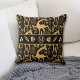 Este travesseiro decorativo apresenta um encantador padrão de estilo "boho" de uma girafa de ouro divertida. Incluídos no padrão com a girafa estão uma borboleta e vários elementos florais, junto com símbolos. O padrão é colocado sobre um fundo preto dramático. O centro tem uma borda preta com alguns dos elementos do padrão repetidos, e seu monograma em dentro de ouro com círculo alinhado. Ambos os lados do travesseiro têm o mesmo padrão, mas a borda que contém o monograma aparece apenas na frente.