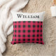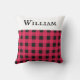 Um travesseiro decorativo de na moda para cama, cadeira ou sofá, com um padrão clássico de design de búfalo em vermelho e preto. No topo está uma banda branca, com seu nome escolhido em letras maiúsculas negras. A almofada de búfalos faz um presente personalizado atraente e útil para amigos, familiares e colegas, no Natal e durante todo o ano.