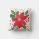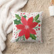 Um travesseiro decorativo quadrado apresenta um design festivo de férias. O travesseiro tem um fundo branco com um padrão de pontos pequenos e espalhados em vários tons de vermelho e rosa. Centrado no travesseiro está uma flor grande, estilizada de poinsettia vermelha, com pétalas pontiagudas. O centro da flor é adornado com um aglomerado de pequenos pontos brancos, parecidos com os estames da flor. Em redor da poinsettia, encontram-se os filhotes de folhas verdes e ocas, com bordas irregulares e aglomerados de pequenas e vermelhas. O estilo geral é simples e gráfico, com cores planas e linhas limpas, dando-lhe uma aparência moderna e alegre.