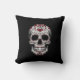 Un coussin avec une tête de mort souriante de couleur grise et rouge sur fond noir. Pourquoi une tête de mort colorée ? Pour exprimer une forme de sourire à la vie avec une tête de mort.