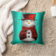 Um travesseiro de Natal colorido com um bonitinho bonitinho vestido de chapéu de veludo vermelho e colete sobre fundo metálico (ou aqua). Esta almofada de Natal engraçada e fofa vai iluminar qualquer casa para as férias.