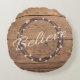 Acredite em design de texto de Natal com coroa e decoração de neve em fundo de madeira rústica
