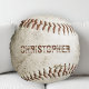 Uma foto de um beisebol vestido fornece o fundo para este travesseiro decorativo redondo personalizado com um nome personalizável em fontes angustiadas em uma sombra de castanho avermelhado que corresponde à costura. Ideal para o fã de beisebol ou esporte na sua lista de presentes.