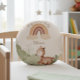 A soft and stylish round pillow featuring a sleeping baby deer with a flower crown, set against a neutral, earthy rainbow and "My sweet baby" text. This bohemian (Boho) nursery design is customized with the name "Oliver," perfect for adding a tranquil and trendy touch to a baby's room.