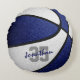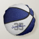 Este travesseiro desportivo de basquete para rapazes ou raparigas apresenta a imagem realista de uma bola de basquetebol que tem painéis coloridos de cor azul e branca alternados - personalize com o nome do jogador numa fonte do estilo "autógrafo" que cobre o número de camisa do atleta - por katz_d_zynes