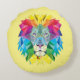 Desenho geométrico de cabeça de leão em arco-íris sobre amarelo. Cores brilhantes fazem um leão majestoso fantástico