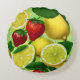 Uma almofada redonda vibrante com limões, limas e morangos brilhantes em um estilo botânico fresco em um fundo verde suave. A paleta alegre e estival adiciona um acento animado às salas de estar, quartos e espaços aconchegantes de leitura. Uma escolha elegante para mulheres que amam motivos frutados, decoração colorida e acessórios para casa prontos para presente.