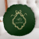 Travesseiro de Natal verde, bonito e clássico, apresenta uma elegante crista dourada com design arco e seu nome personalizado com o tradicional roteiro de caligrafia.