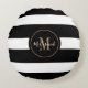 Adicione um toque de design elegante a uma sala com este Travesseiro redondo Dourado da família Black and White Stripes Monogrammed. Este design moderno tem faixas pretas horizontais sobre fundo branco e borda do círculo preto no centro. Sua inicial está em letras simples de ouro falso e personalizada com o nome em um roteiro de cartas manuais de tendência branca. Clique na opção personalizar modelo e siga as instruções.