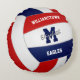 Este travesseiro de vôlei apresenta a imagem realista de um vôlei que tem painéis vermelhos, azuis marinhos e brancos, sobre o qual você pode personalizar o nome do jogador, o monograma ou a carta de varidade, o nome da equipe e da mascote na frente e o número de jersey no verso - por katz_d_zynes