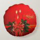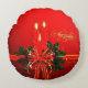 Adicione calor e festividade à sua casa. Decore sua casa com esta almofada redonda elegante e sofisticada que apresenta três velas vermelhas, laço vermelho e dourado e folhas verdes de natal em um fundo vermelho, Será um ótimo complemento para a sua decoração de natal. Você pode personalizá-la excluindo o modelo "Feliz Natal" ou alterando-o com sua própria mensagem.