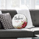 Este design de Feliz Natal apresenta "Acredite" em um roteiro de caligrafia moderno, com texto vermelho personalizado que pode ser personalizado com seu nome e data. Linda floral vermelha com bagas e sotaque verde o design. Design é o mesmo em ambos os lados do travesseiro. Uma maravilhosa adição à sua decoração de casa de férias!