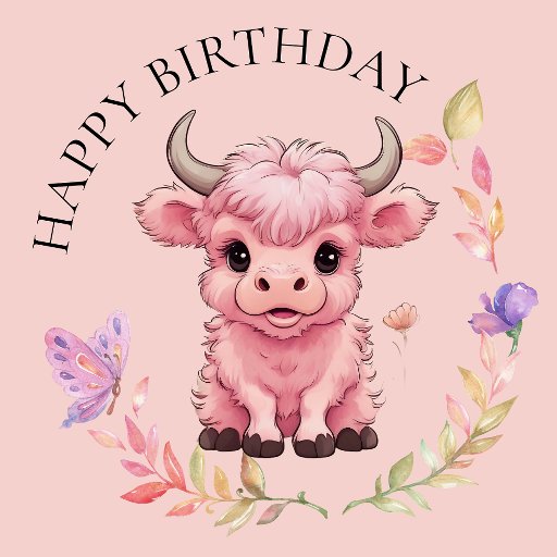 Floffy Pink Highlands Scottish Cow, este design apresenta uma bonita e Fluffy Pink Highlands Scottish Cow com olhos sonoros, rodeada por flores. Um design bonito para qualquer Festa de aniversário de criança.