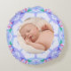 Fácil Bonito Pastel Personalizado Cushion de Foto de Natal. Pastas Felizes e Festivas Roxo, Verde e Cor-de-Rosa Foto Personalizada Decoração Redonda. Um travesseiro decorativo circular suave e colorido para o seu inverno e sala de estar multicolorida roxa e verde e decorações de quarto. A design de quadro é um padrão geométrico de abstração feliz que assume os designs festivos de blocos coloridos tradicionais. Em cores pastéis de lilás de lavanda com verde de árvore de inverno, e cor-de-rosa bonito para a Terra das Maravilhas de inverno. Personalize-o substituindo as duas fotos, na frente e atrás, por suas próprias para um presente inicial para a família e amigos celebrarem o Natal. A foto mostra um bebê dormindo. Tome suas memórias de Yuletide. Um presente de excelente para melhores amigos, irmãos e irmãs, ou casais. Um presente amigável, para comemorações familiares ou para os primeiros Natal.