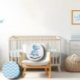 Esta almofada fofa para um quarto de bebê ou de criança pode ser apresentada de ambos os lados. Um lado design geométrico dá um talento moderno e o outro apresenta um dinossauro amigável com uma redação personalizável.