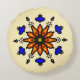 Este mandala único desenhado à mão apresenta um charme rústico e artístico com variações naturais no alinhamento do padrão. O vibrante design de explosão solar em laranja e azul cria um ponto focal impressionante para qualquer quarto."