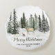 Este travesseiro redondo de feriado apresenta floresta de inverno com família de veados e neve e personalizado com seu texto personalizado. A parte traseira apresenta a camada de neve sobre fundo verde escuro.
