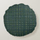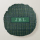 O travesseiro de sotaque na moda redondo apresenta um padrão de tweed de Oxford azul / verde com um monograma personalizável no centro.