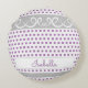 Esta almofada redonda é simples, mas elegante, com um design que apresenta bolinhas roxas lavanda em quadrado com listras cinzas e redemoinhos brancos. O design é personalizável com um espaço para inserir um nome. Perfeito para uma nursery ou quarto de menina.