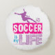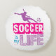 Travesseiro decorativo redondo de futebol feminino colorida com o texto, "SOCCER é minha vida". Tem uma silhueta de futebol jogando uma bola de futebol sobre o texto. ©gollygirls.com