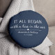 Onde tudo começou... Almofada fofa com a localização e a data em que se conheceram, com um coração adorável. Escolha sua cor e personalize este design personalizado com seus próprios nomes e texto. Presente perfeito para contar sua história de amor no Dia dos Namorados, seu Aniversário ou Casamento, e celebrar o início de algo especial.