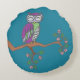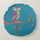 Coruja roxa ilustrada em árvore floreada rosa contra fundo azul-da-meia-noite.