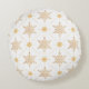 Travesseiro redondo com elegante falso revestimento de folha de ouro imitando flocos de neve e padrão de estrelas em fundo branco.